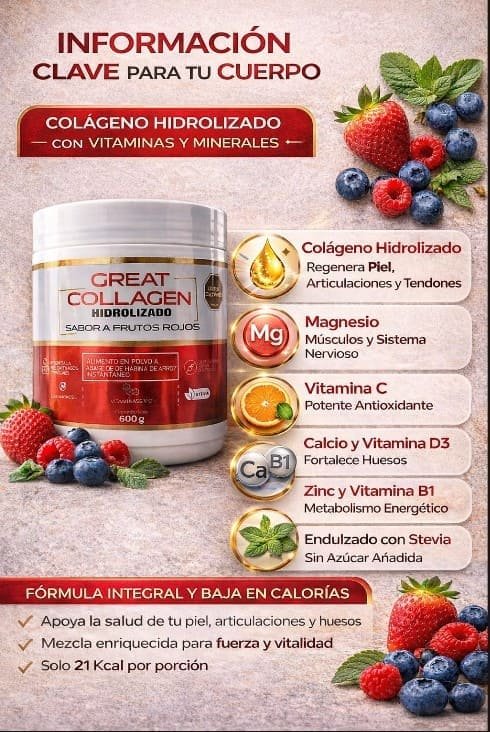 Great Collagen Hidrolizado es un suplemento nutricional de alta calidad formulado para fortalecer la estructura natural del cuerpo, apoyando la salud de la piel, las articulaciones, los tendones, los músculos y los huesos. Su fórmula combina colágeno hidrolizado de fácil absorción con vitaminas y minerales esenciales que contribuyen al bienestar general y a una vida activa.